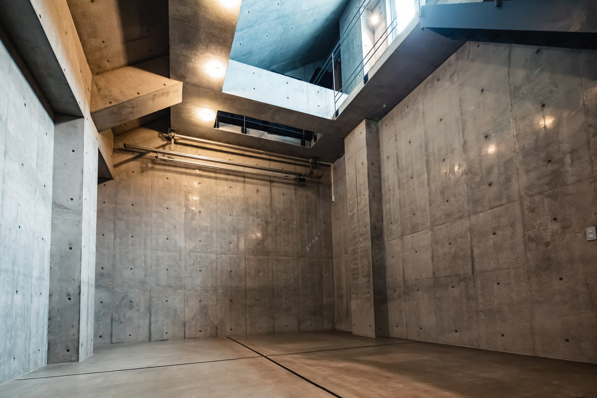 コンクリート打ちっ放しの内装で、天井が高く自然光が入るお洒落なスタジオです。